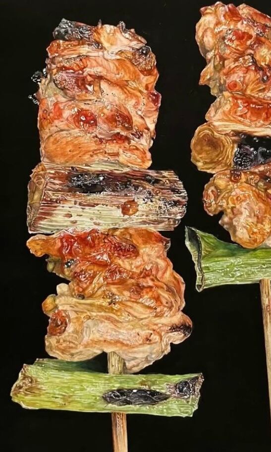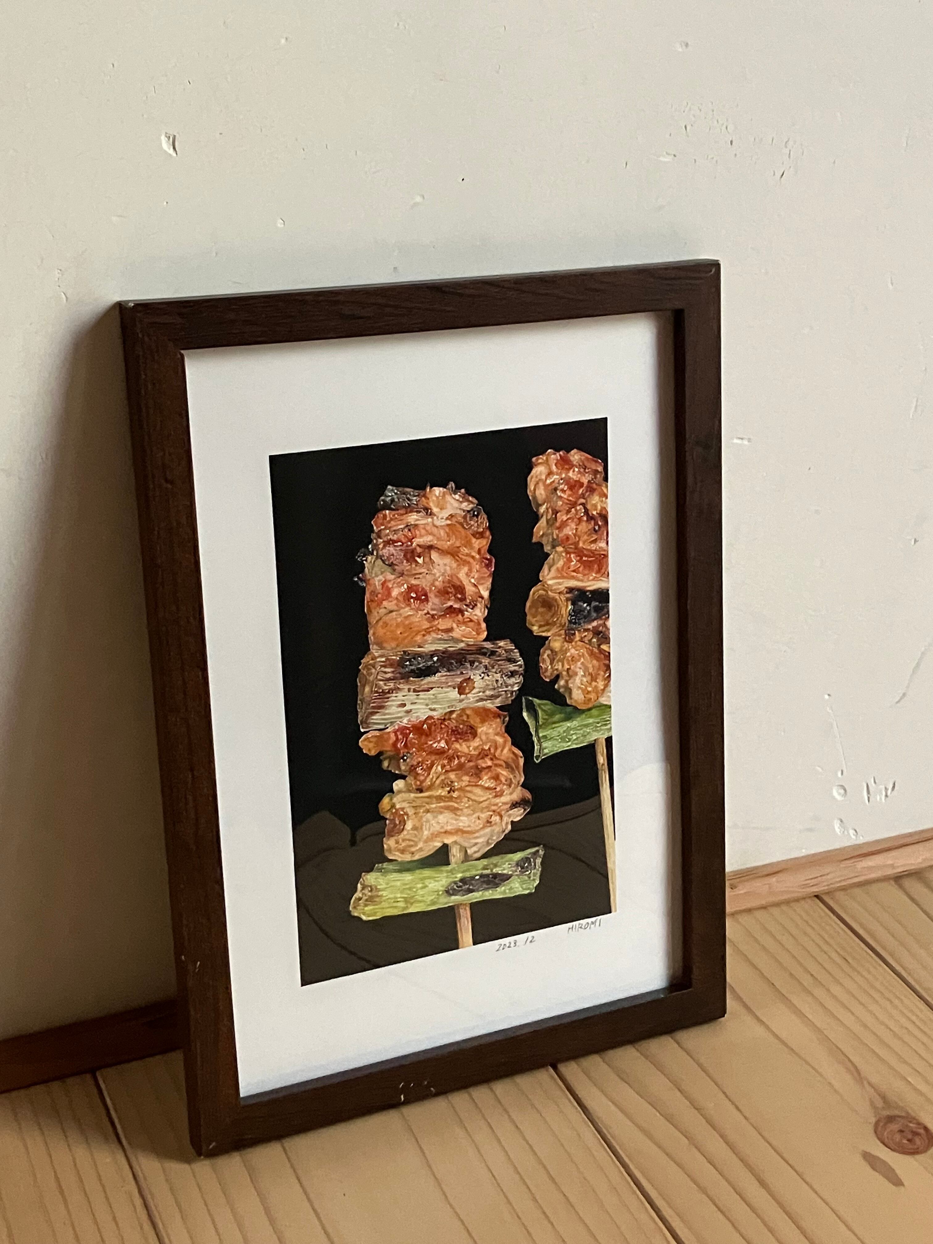 炭火で焼いた香ばしい焼き鳥をリアルに描いた一枚です。縦向き横向きで雰囲気が変わります。焼き鳥好きな人への贈り物としても最適です。