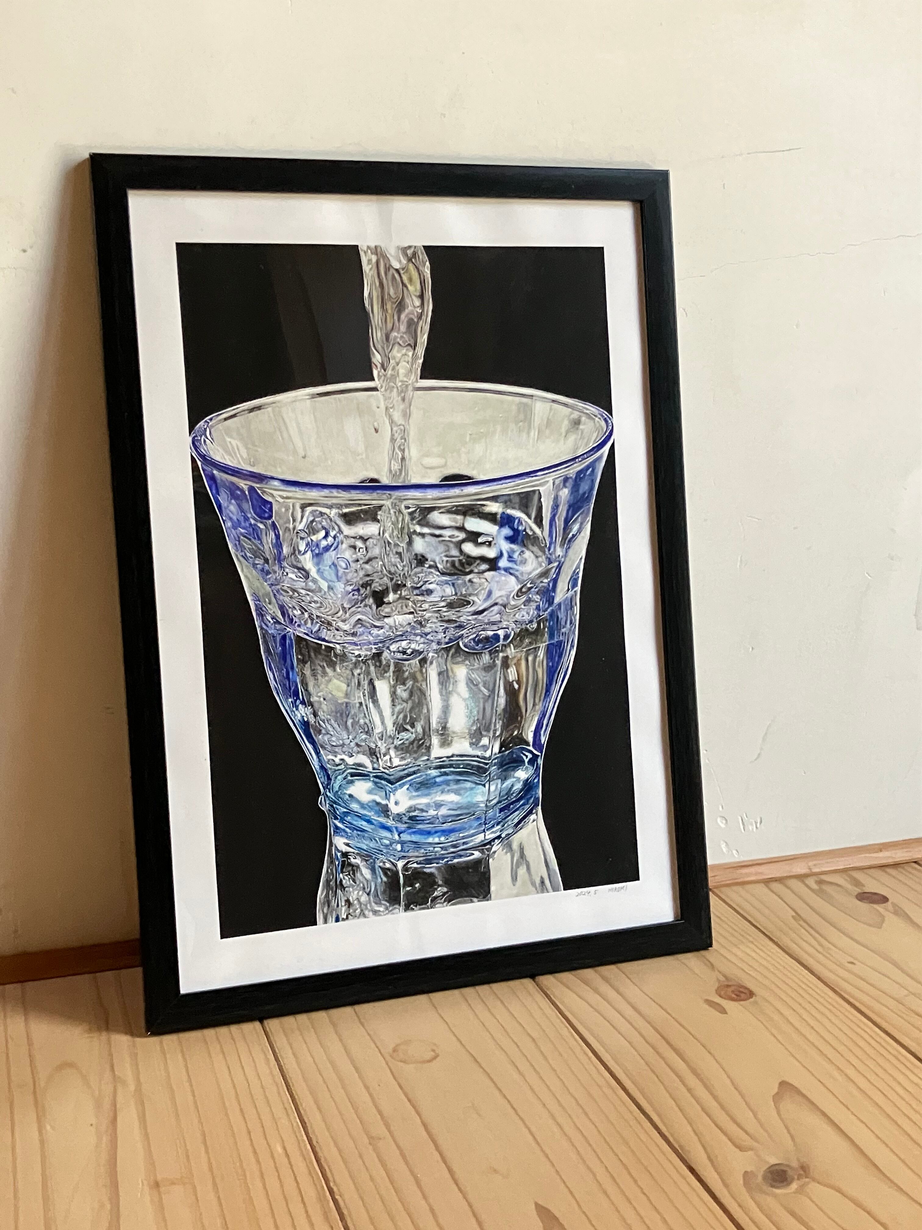 コップの透明感、水の躍動感が際立つA3サイズのリアルアートです。あなたのお部屋に夏の爽やかさと癒しをお届けします。